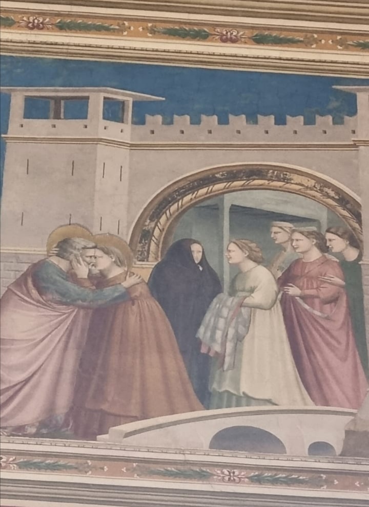 Adesso concentriamoci sulle pareti. Il primo registro, quello più in alto, racconta la vita di Maria e dei suoi genitori, Anna e Giacchino. Tra questi riquadri, quello che colpisce maggiormente è quello dell’incontro alla Porta Aurea di Gerusalemme, dove possiamo vedere il primo, vero bacio della Storia dell’Arte, tra Anna e Gioacchino; un bacio d’amore, intenso.