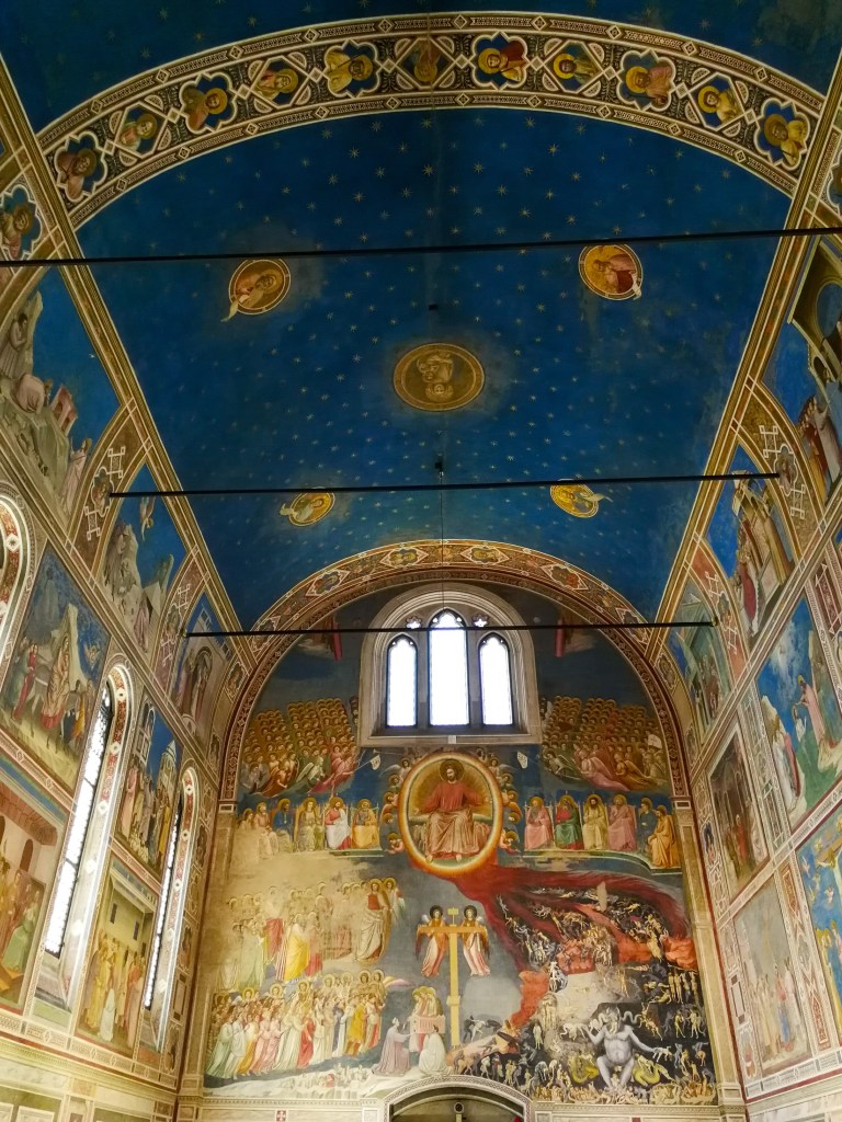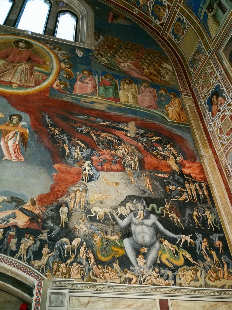 E, infine, arriviamo alla controfacciata dove campeggia l’immenso e magnifico Giudizio Universale. In alto, due angeli arrotolano il cielo come se fosse un sipario; alle loro spalle le porte di Gerusalemme. Sotto di loro, i santi. Al centro, il Cristo Giudice, ai cui lati siedono i dodici apostoli. A destra, un fiume di fuoco diviso in quattro braccia, si stacca da Cristo e scende verso la lugubre concezione medievale dell’Inferno, luogo di pene e tormenti strazianti e indicibili, con un gigantesco Lucifero blu nerastro che domina la scena. Intorno a lui, uomini e donne sottoposti a torture efferate, le stesse che erano ampiamente praticate in quell’epoca, e decine di diavoli blu ciano. In particolare, si scorge un vescoco, con un sacchetto in mano, intento a benedire un uomo: qui Giotto ha voluto condannare la pratica della simonia. A sinistra, le schiere degli angeli con due processioni degli eletti, tra i quali possiamo scorgere anche l’autoritratto di Giotto, dipinto con la veste rosa e il cappello giallo. In basso, i defunti nudi escono dalle tombe. Un affresco davvero incredibile per la quantità di dettagli e per i colori forti e vivi; quasi un libro di Storia medievale: magnifico!