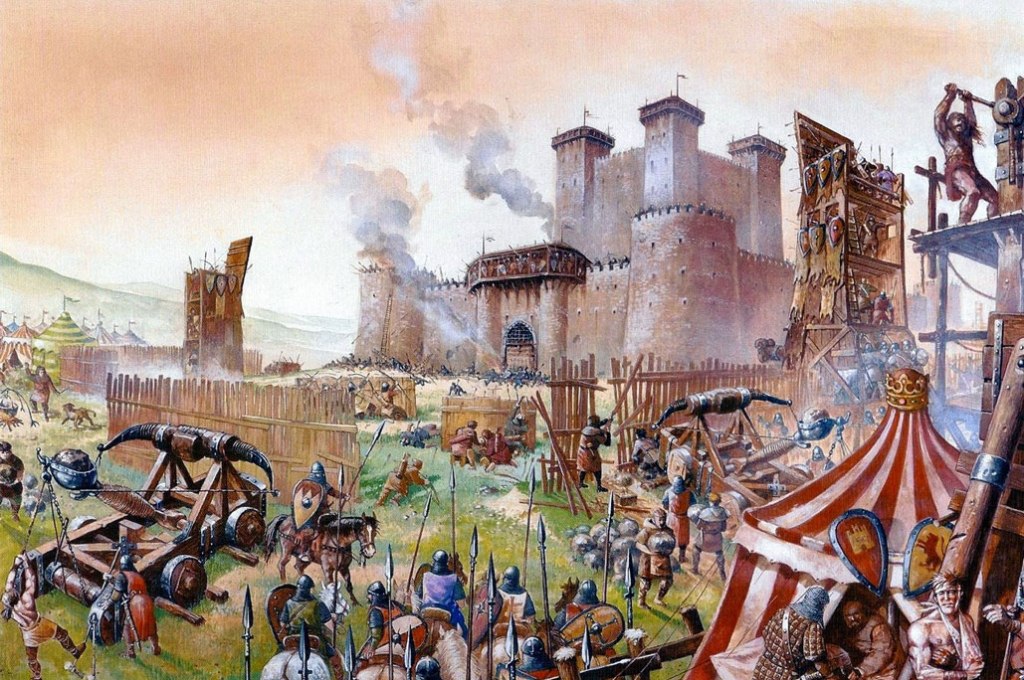 A livello quantitativo, subito dopo i saccheggi venivano gli assedi dei luoghi fortificati, come conseguenza del fenomeno dell’incastellamento del X e XI secolo. La fortificazione veniva avvicinata con i plutei, ossia grandi scudi su ruote che proteggevano i tiratori, i quali spianavano il terreno e colmavano il fossato difensivo per permettere ai mezzi pesanti di agire sulle mura. Il primo mezzo pesante era la testuggine, un capannone blindato con un tetto inclinato che faceva scivolare i proiettili e le materie incendiarie lanciate dall’alto dal nemico. Sotto la testuggine, i minatori arrivavano alle mura per aprire brecce con l’ariete, cioè una grossa trave con la testa ferrata. Poi vi era la torre mobile più alta delle mura, montata su ruote, spinta da uomini al suo interno e munita di ponti volanti che permettevano di superare le mura dall’alto. Anche le scale d’assalto avevano le ruote ed erano più difficili da rovesciare per il nemico. Tutti questi mezzi erano di legno, pertanto venivano ricoperti di pelle di bovino, strati di terra e materiali imbevuti d’aceto per essere protetti contro il fuoco. Erano poi accompagnati dal tiro delle artiglierie, ossia mezzi che facevano piovere proiettili di pietra sulle difese nemiche, come il mangano e, successivamente, il trabucco. Sottoterra, invece, si potevano aprire gallerie per far crollare le mura ed entrare all’interno di sorpresa. Tutti i componenti dell’attacco dovevano agire nello stesso momento.